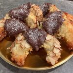 Lightly beat your second egg white in a small bowl. Use a pastry brush to coat each log thoroughly with the egg white; this acts as the glue for our crunch layer. Roll the damp logs in the sliced almonds, pressing gently so the nuts adhere to the surface. Bend each log into a crescent or ‘horn’ shape and place them on your prepared tray.
