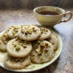 Cardamom pistachio cookies served on a plate with a cup of chai tea