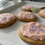 - Make the icing by creaming 1/2 cup softened butter, then adding powdered sugar, 1 teaspoon almond extract, milk, and pink food coloring.