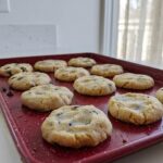 Freshly baked keto chocolate chip cookies on a baking sheet